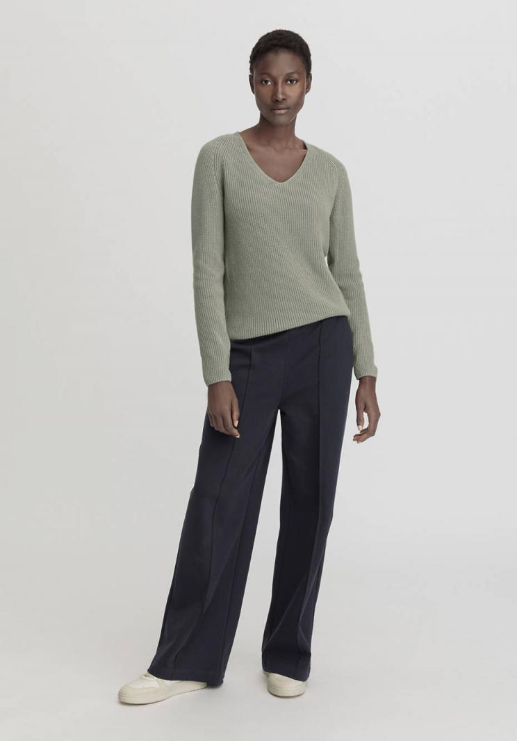 Die klare Form und der pure Look zeichnen diesen hochwertigen, fein gerippten, weichen Strickpullover mit V-Ausschnitt aus.